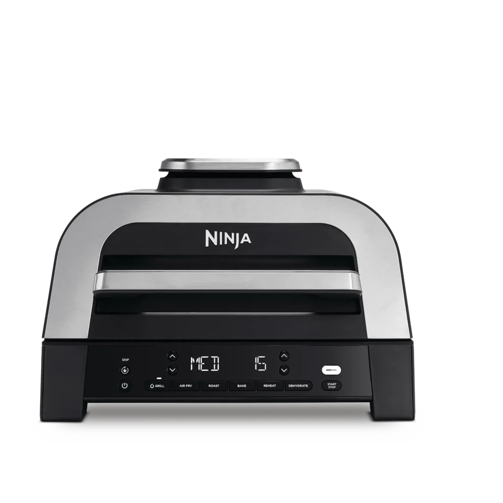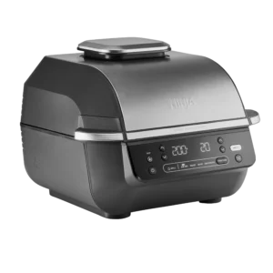 Запознайте се с Ninja 6-in-1 MAX Grill & Air Fryer – големият, многофункционален уред, който може да грилова, готви с горещ въздух, пече и още. Добавете автентичен опушен вкус и текстура на месо, зеленчуци и риба или хрупкав завършек на пържени картофи и други любими ястия.